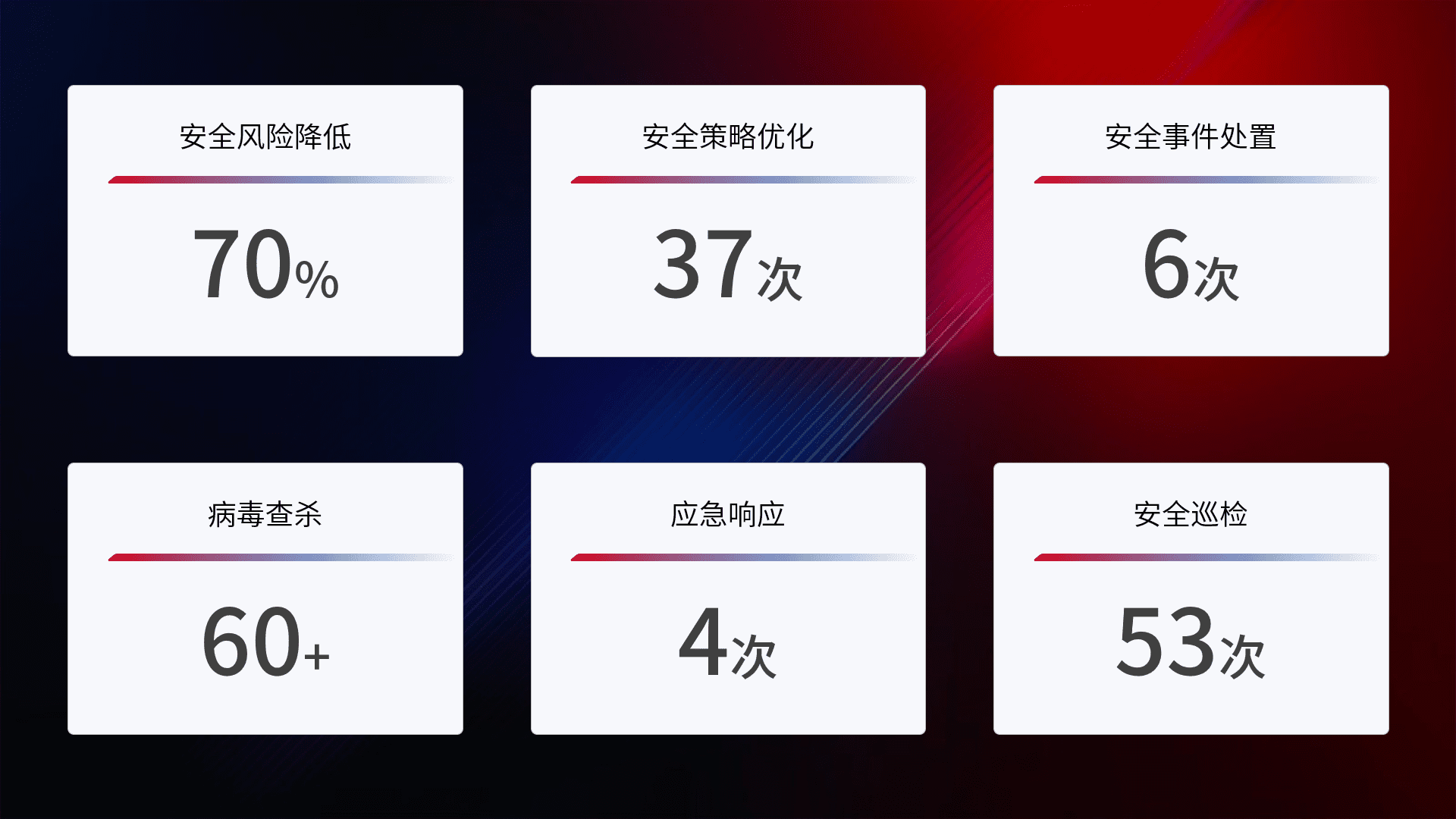 提供全面的安全事件报告体系,,包括处置报告、、、周报、、、、季度和年度总结,,,结合持续监控,,,,帮助客户深入了解网络安全状况。。。